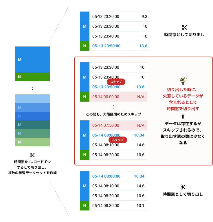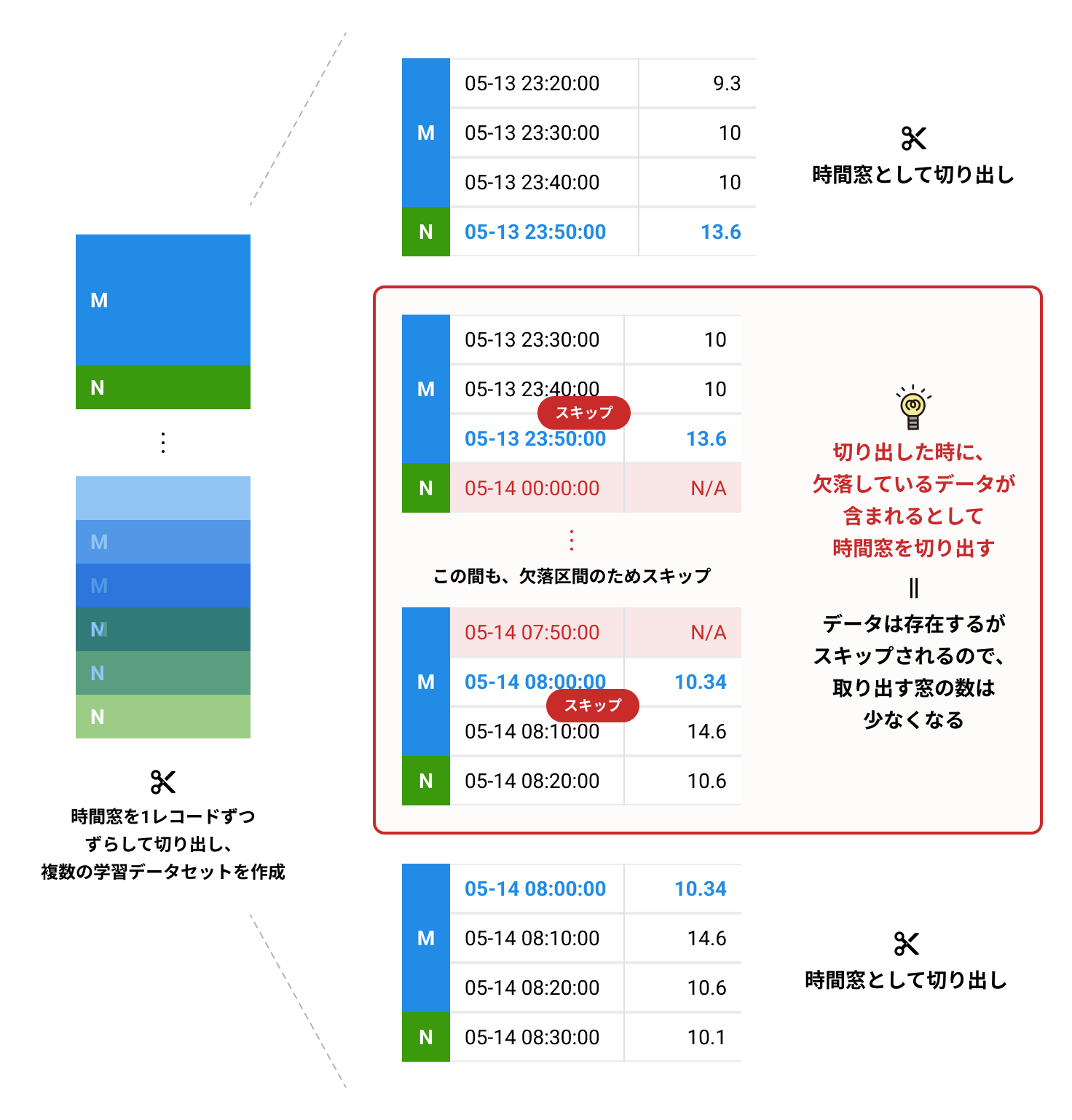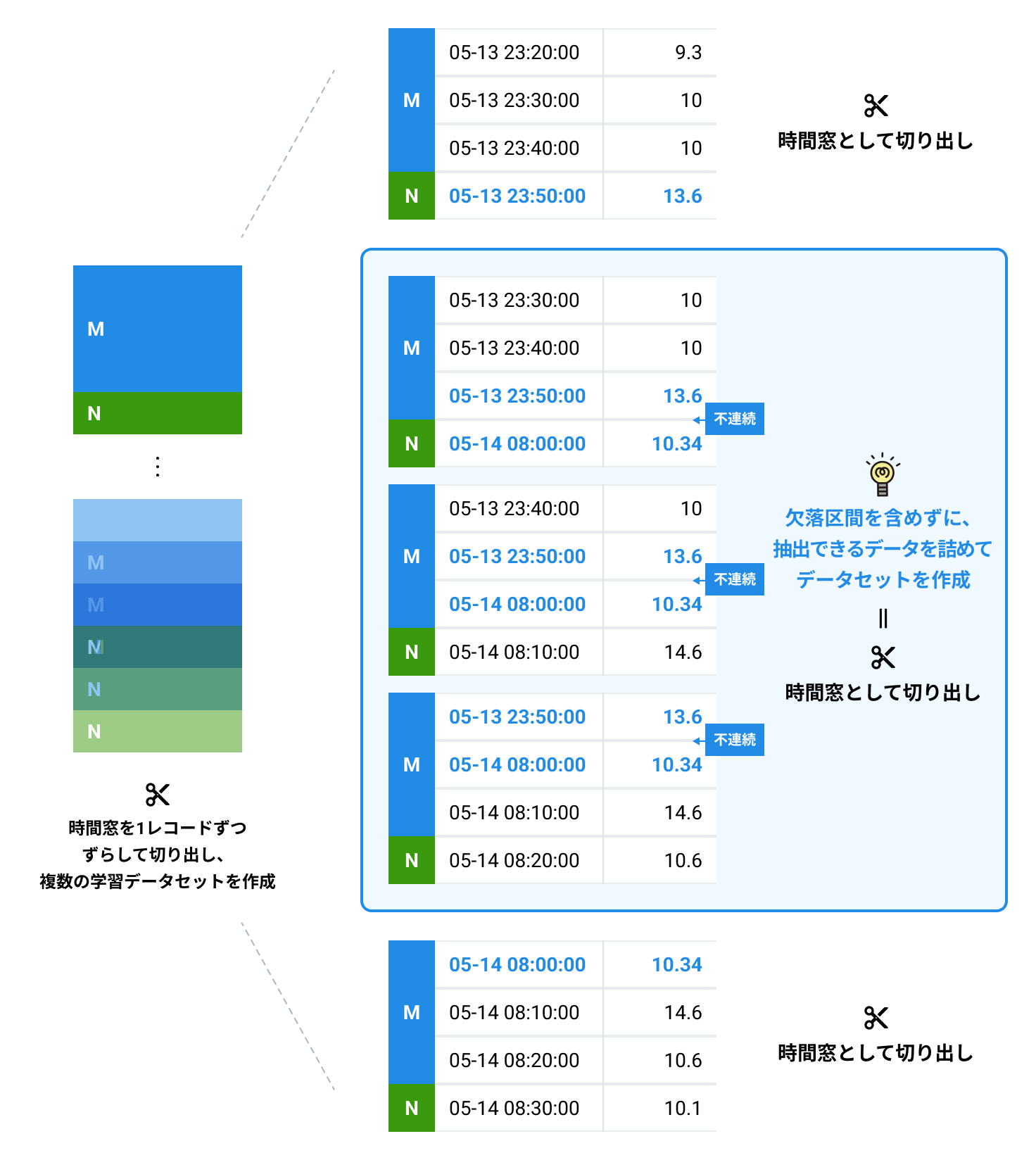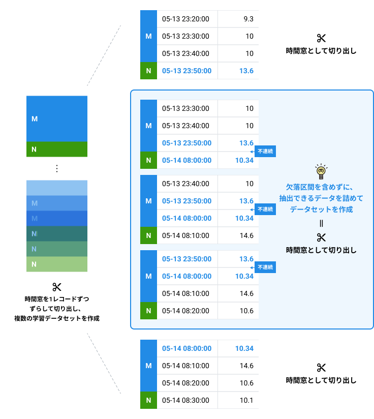 データセットで欠落している期間がある場合、その期間は自動的に回避して時間窓切り出しを行います。