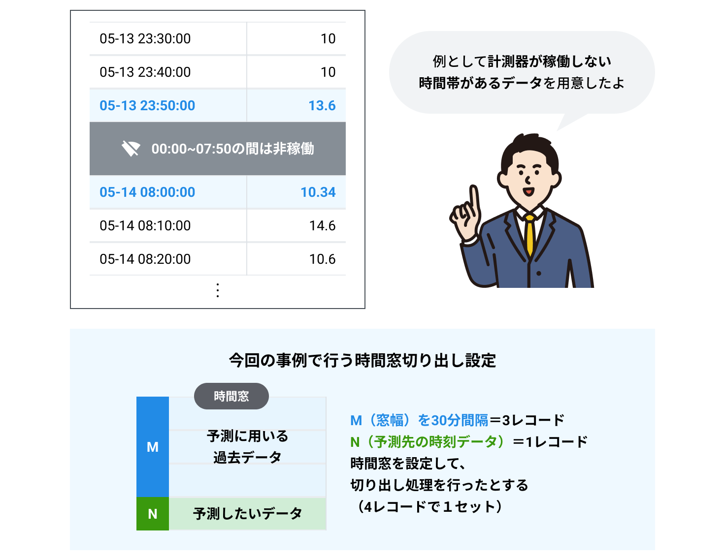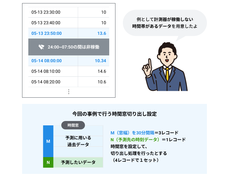 | OFFの場合 | 時刻の欠落が定期的である場合などは、切り出し後のデータ数が増やせるためモデルの精度向上が見込めます。 また、月次データを扱うことができます。 | 時刻が不連続である(欠落がある)場合でも連続的にデータを切り出すため、分析者が意図しない時間窓データが生成され、モデルの精度低下につながる場合があります。 | ・月次データ ・土曜日と日曜日のみにデータが存在しない日次データ ・ミリ秒単位などに小さな時間誤差があるセンサーデータ(本来はリサンプリングなどで事前に対処することを推奨) |