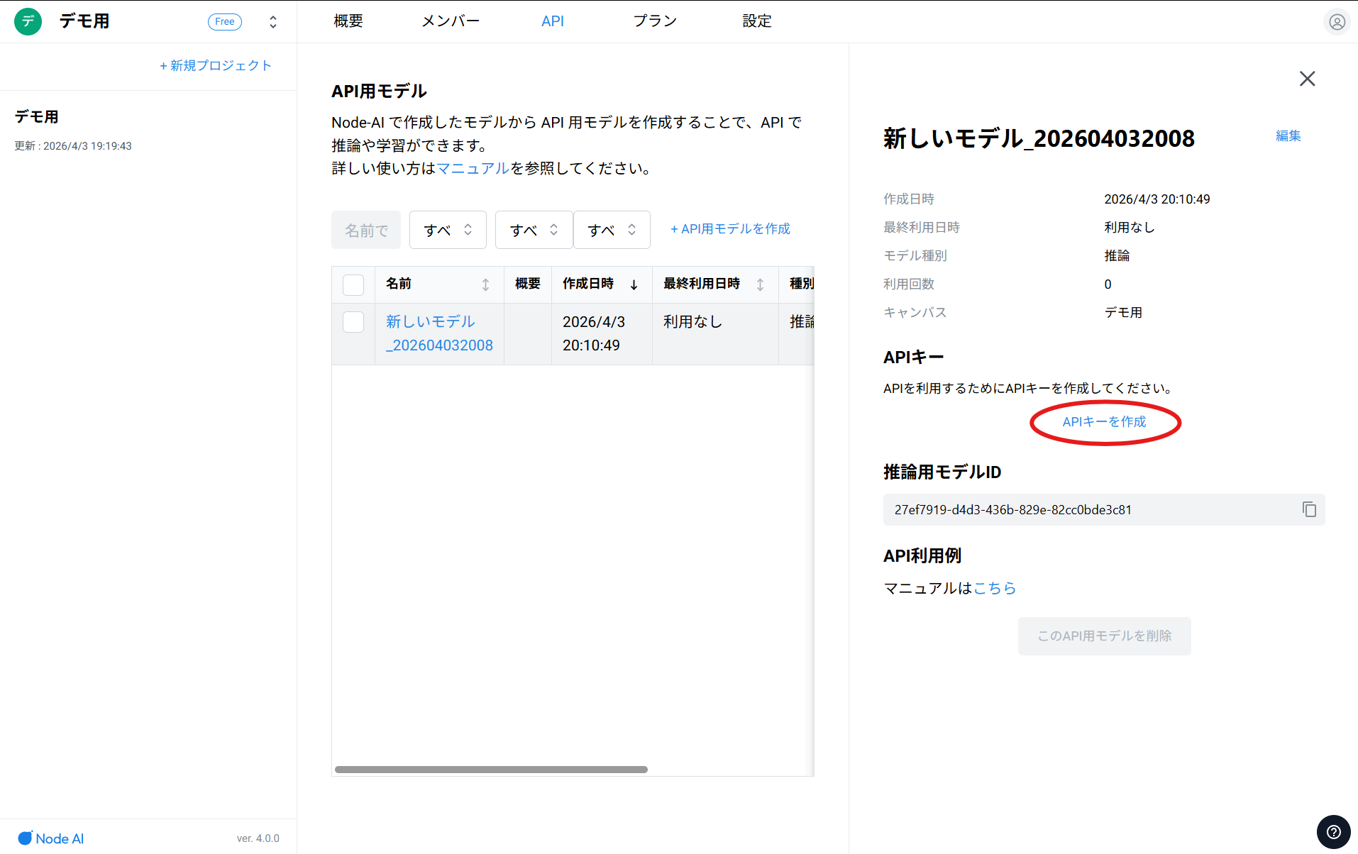 Node-AI の API タブ に進んでいただき、「API用モデルを作成」ボタンを押してください。