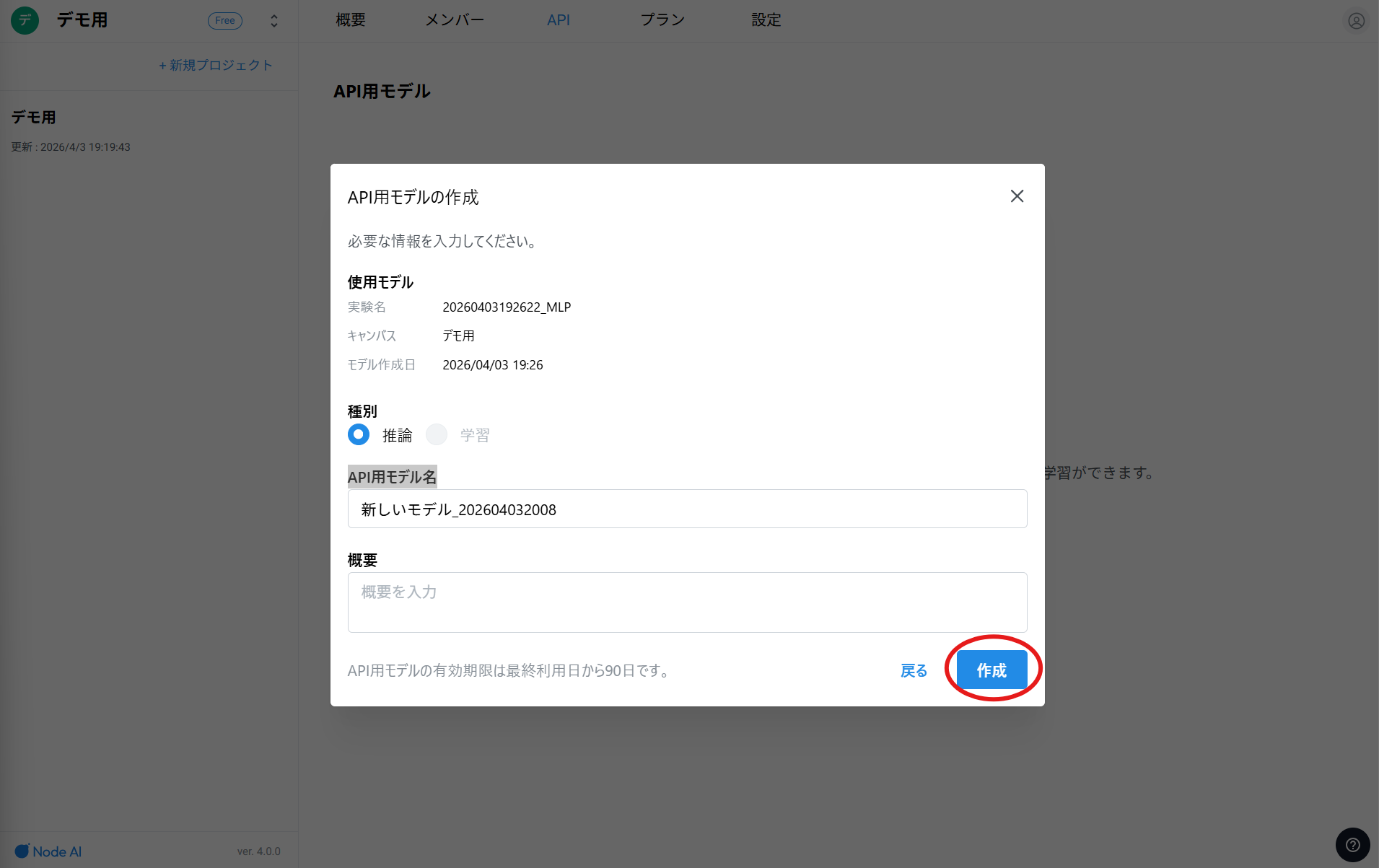 Node-AI の API タブ に進んでいただき、「API用モデルを作成」ボタンを押してください。