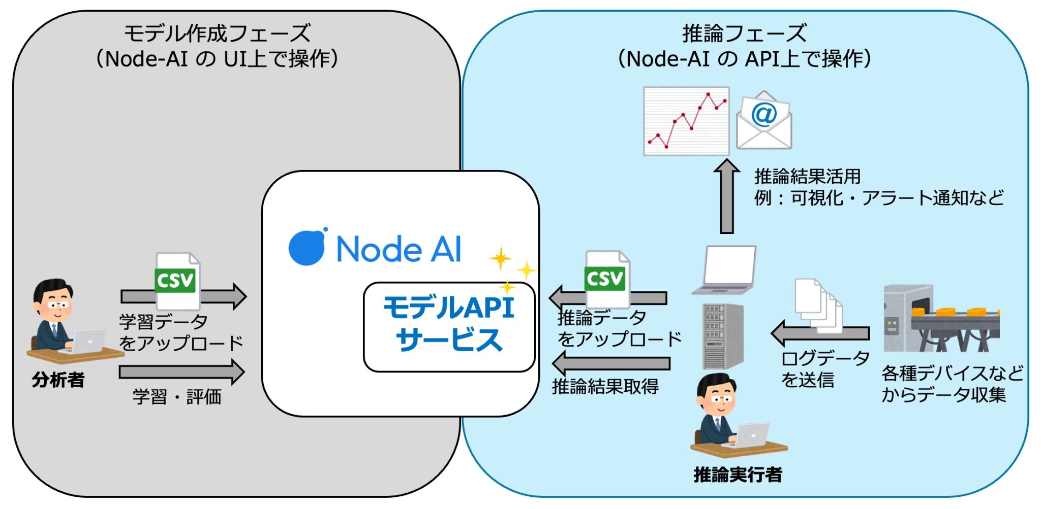 | 推論 API の作成 | Node-AI で作成したAIモデルに対して任意のデータで推論が可能な API を作成します ※ 以下のモデルに対応しています(2026年4月時点)。 ・予測: ・MLP ・線形モデル (+ 要因分析) ・LightGBM (+ 要因分析) ・Prophet |