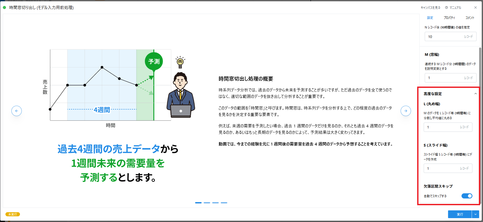 - 切り出しの基準点から N レコード先の値を予測する設定となります。