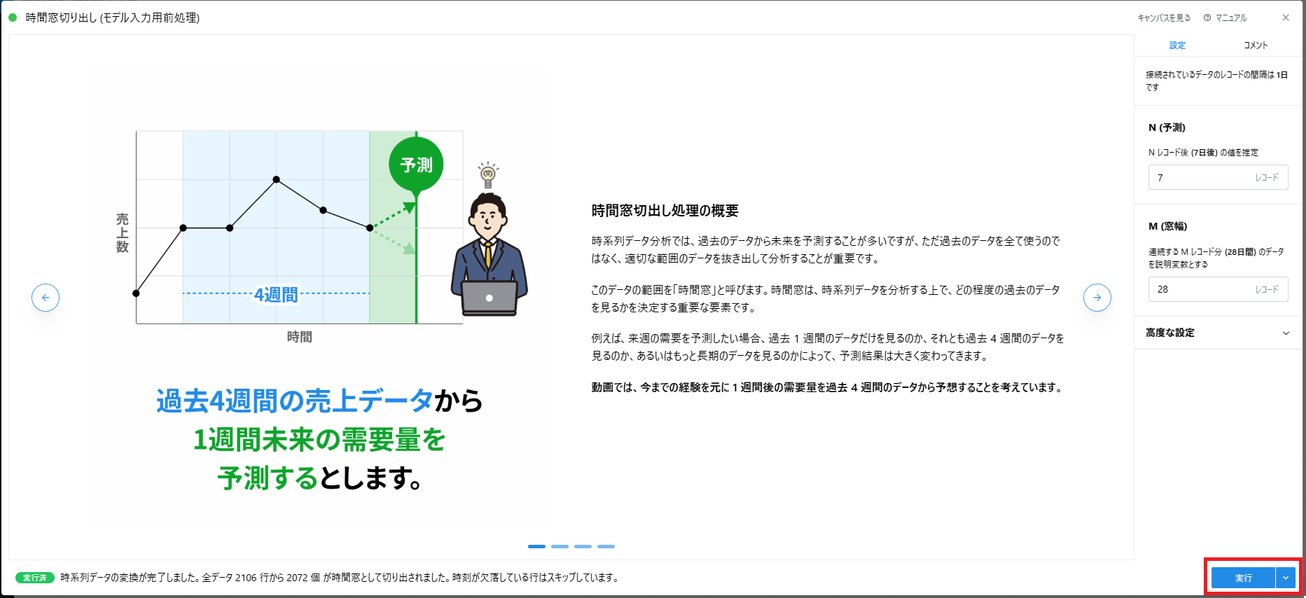 - 例えば、日次データにおいて7日後の値を予測するAIモデルを作成したい場合は、N を 7 に設定します。