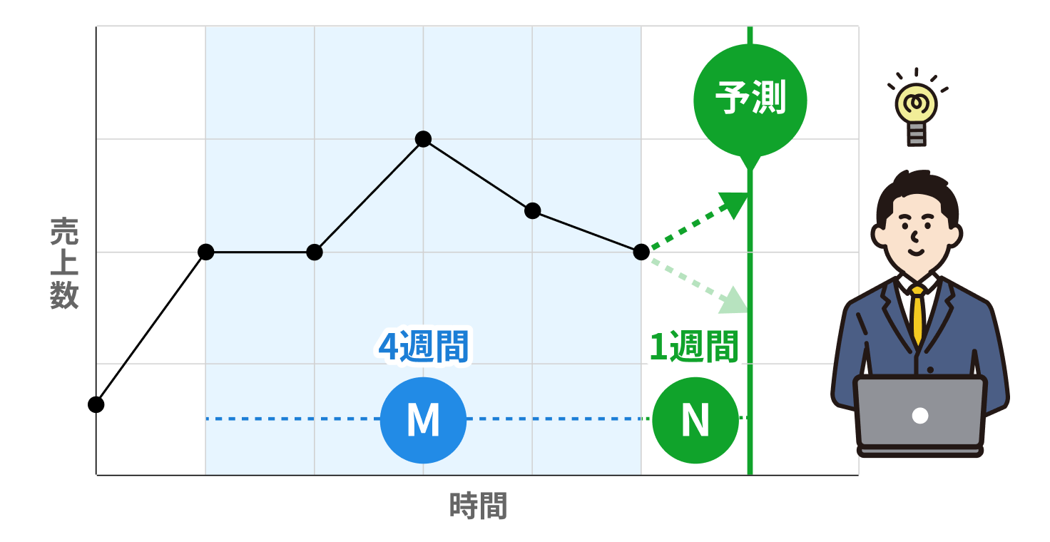 - 例えば、日次データにおいて過去28日分のデータを元に予測するAIモデルを作成したい場合は、M を 28 に設定します。